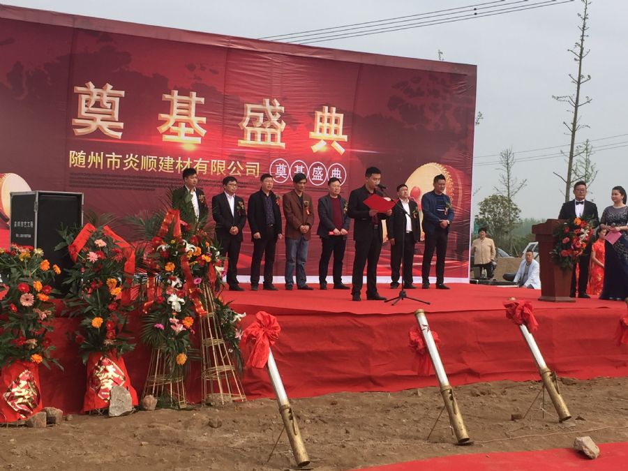4月14日上午,隨州市炎順建材有限公司項目奠基儀式于隨縣新經(jīng)濟開發(fā)區(qū)新項目建設(shè)基地隆重舉行,炎順瓦業(yè)公司董事長劉永德,總經(jīng)理劉炎、衡陽炎順瓦業(yè)公司總經(jīng)理劉永才、總監(jiān)陳月棟,泉州炎順瓦業(yè)公司總經(jīng)理劉歡、總監(jiān)劉東方以及公司運營部、財務(wù)部、研發(fā)部、廠區(qū)、質(zhì)保部等相關(guān)負責(zé)人攜全體員工共同參加了本次儀式,同時蒞臨奠基儀式的嘉賓有隨縣政府的副縣長,江蘇波美特瓦業(yè)有限公司宋總攜夫人等考察團一行。 據(jù)相關(guān)資料顯示,炎順集團隨州基地概況:占地面積:40畝、投資金額:1億5000萬、工廠面積:1萬平方米、辦公樓面積:2800平方、住宅樓面積:2800平方、就業(yè)人員:200人、年產(chǎn)值:1.2億元人民幣。